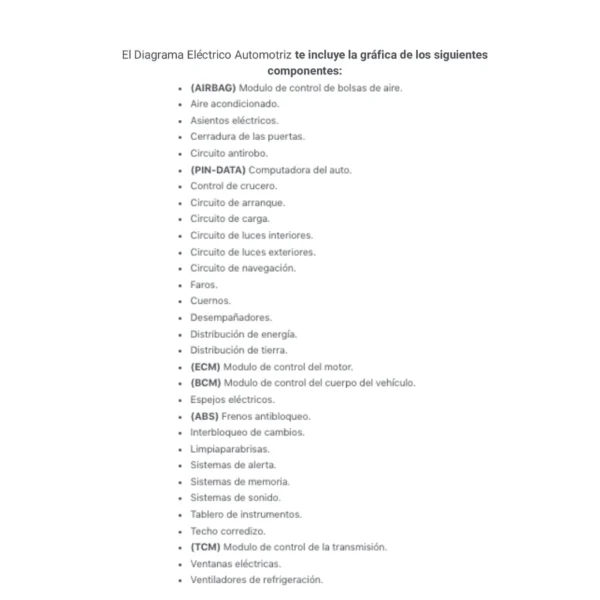 El Diagrama Eléctrico Automotriz te incluye la gráfica de los siguientes componentes: