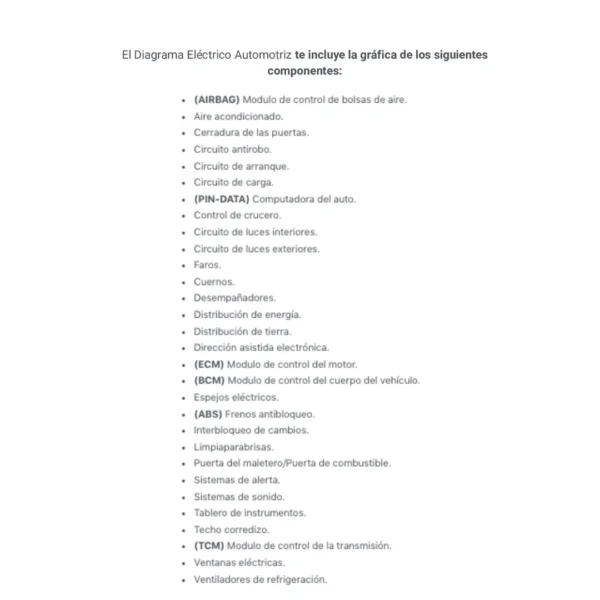 El Diagrama Eléctrico Automotriz te incluye la gráfica de los siguientes componentes: