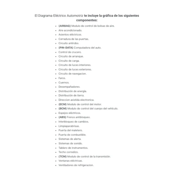 El Diagrama Eléctrico Automotriz te incluye la gráfica de los siguientes componentes: