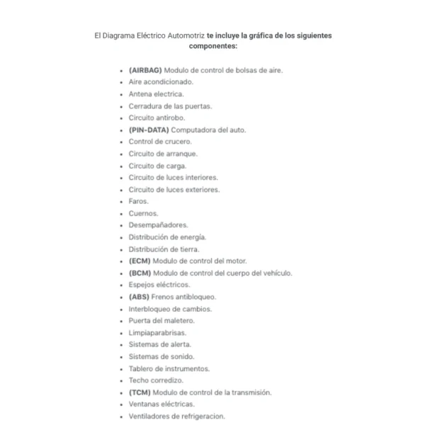El Diagrama Eléctrico Automotriz te incluye la gráfica de los siguientes componentes: