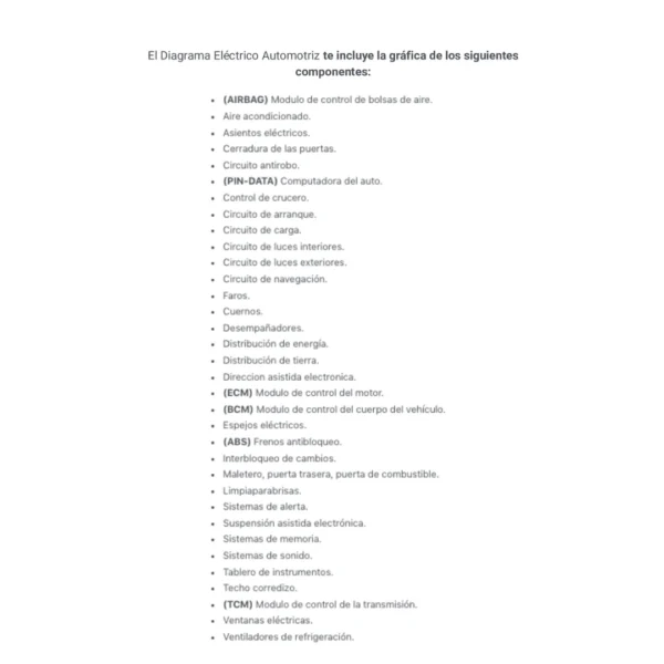 El Diagrama Eléctrico Automotriz te incluye la gráfica de los siguientes componentes: