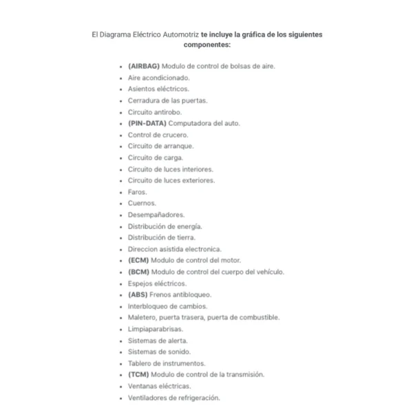 El Diagrama Eléctrico Automotriz te incluye la gráfica de los siguientes componentes: