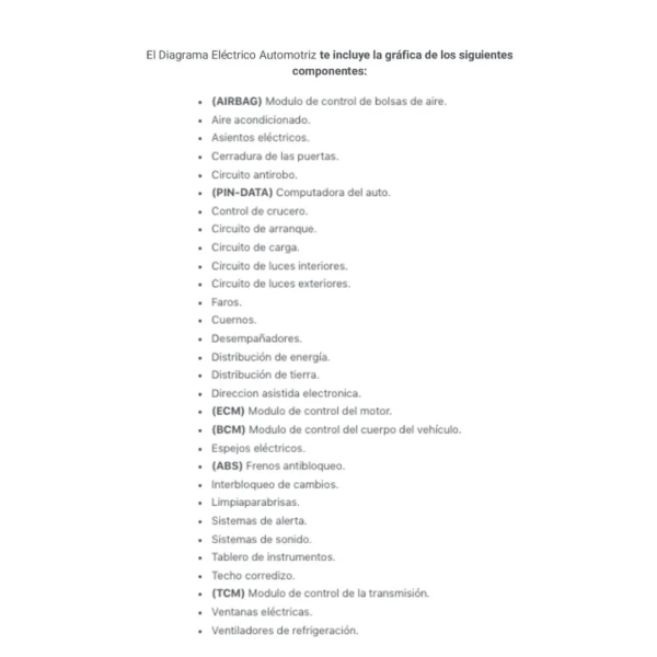 El Diagrama Eléctrico Automotriz te incluye la gráfica de los siguientes componentes:
