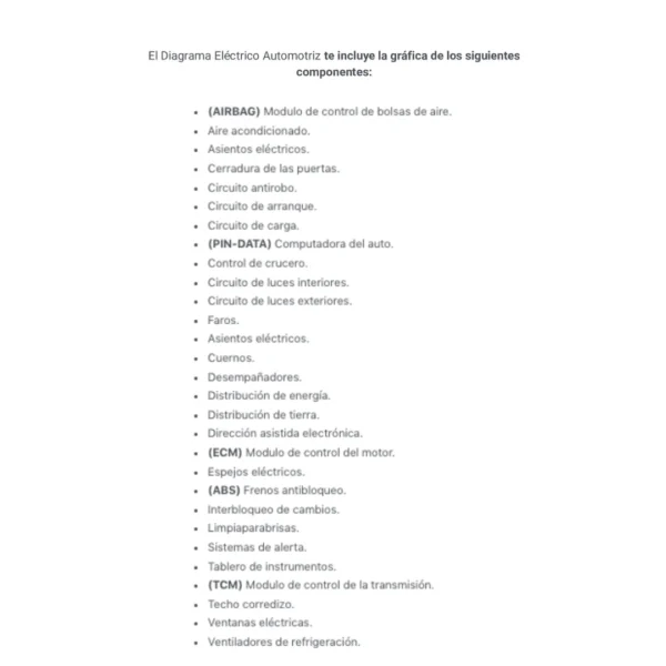 El Diagrama Eléctrico Automotriz te incluye la gráfica de los siguientes componentes: