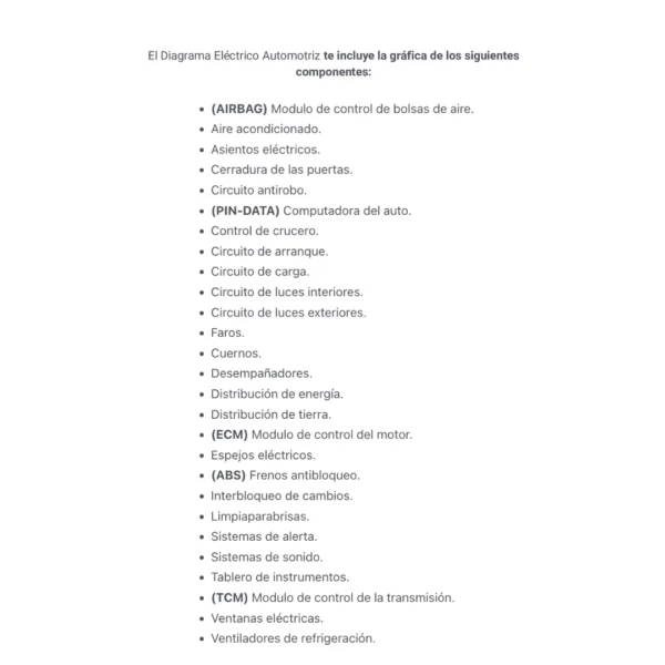 El Diagrama Eléctrico Automotriz te incluye la gráfica de los siguientes componentes:
