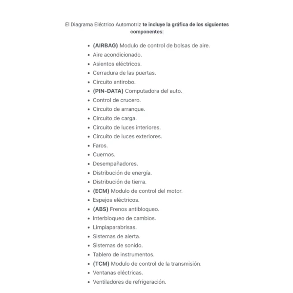 El Diagrama Eléctrico Automotriz te incluye la gráfica de los siguientes componentes: