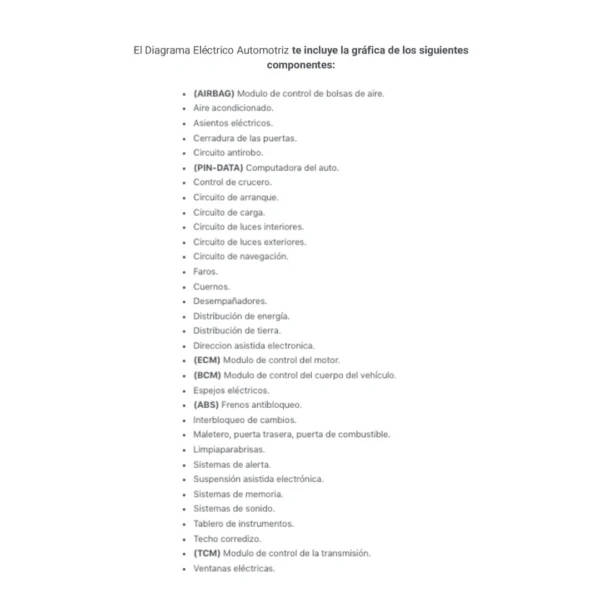El Diagrama Eléctrico Automotriz te incluye la gráfica de los siguientes componentes: