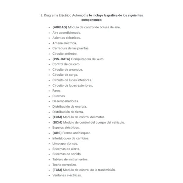 El Diagrama Eléctrico Automotriz te incluye la gráfica de los siguientes componentes: