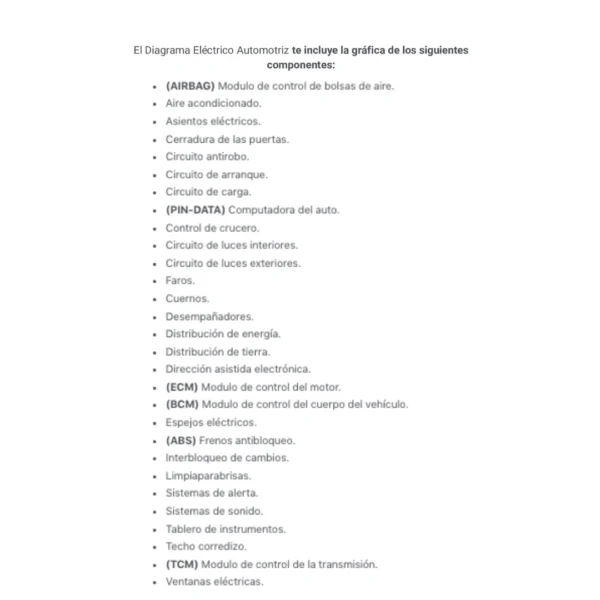El Diagrama Eléctrico Automotriz te incluye la gráfica de los siguientes componentes: