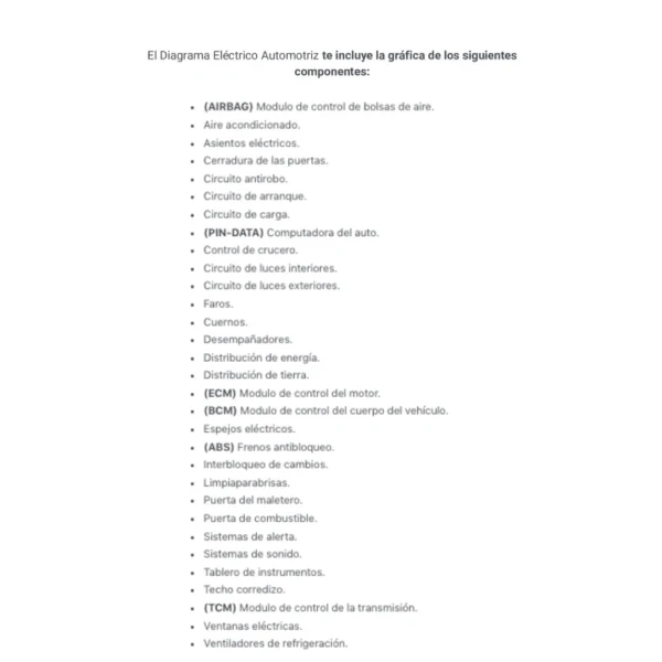 El Diagrama Eléctrico Automotriz te incluye la gráfica de los siguientes componentes: