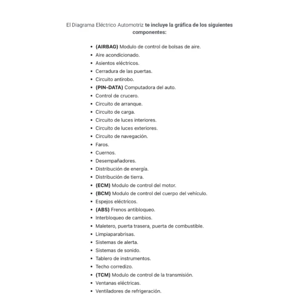El Diagrama Eléctrico Automotriz te incluye la gráfica de los siguientes componentes:
