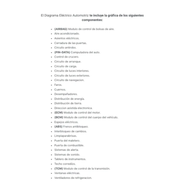 El Diagrama Eléctrico Automotriz te incluye la gráfica de los siguientes componentes: