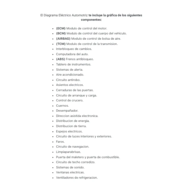 El Diagrama Eléctrico Automotriz te incluye la gráfica de los siguientes componentes: