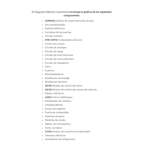 El Diagrama Eléctrico Automotriz te incluye la gráfica de los siguientes componentes: