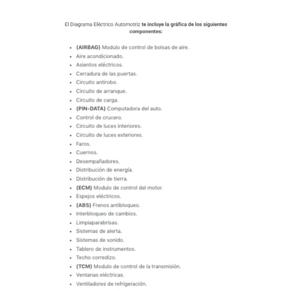 El Diagrama Eléctrico Automotriz te incluye la gráfica de los siguientes componentes: