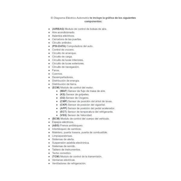 El Diagrama Eléctrico Automotriz te incluye la gráfica de los siguientes componentes: