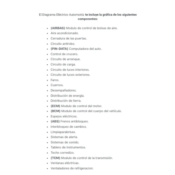 El Diagrama Eléctrico Automotriz te incluye la gráfica de los siguientes componentes: