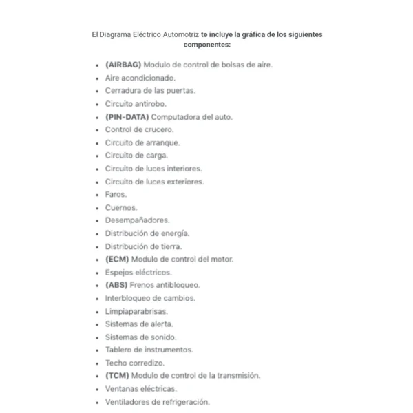 El Diagrama Eléctrico Automotriz te incluye la gráfica de los siguientes componentes:
