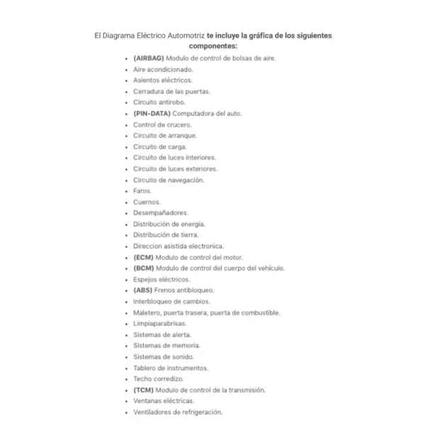 El Diagrama Eléctrico Automotriz te incluye la gráfica de los siguientes componentes: