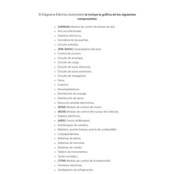 El Diagrama Eléctrico Automotriz te incluye la gráfica de los siguientes componentes:
