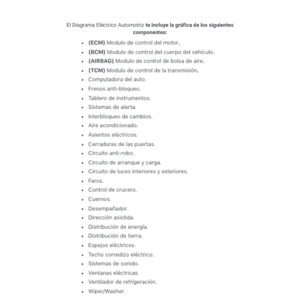 El Diagrama Eléctrico Automotriz te incluye la gráfica de los siguientes componentes: