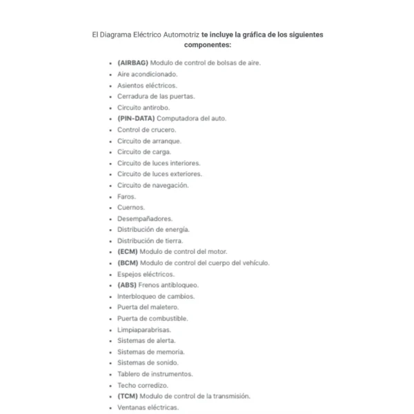 El Diagrama Eléctrico Automotriz te incluye la gráfica de los siguientes componentes: