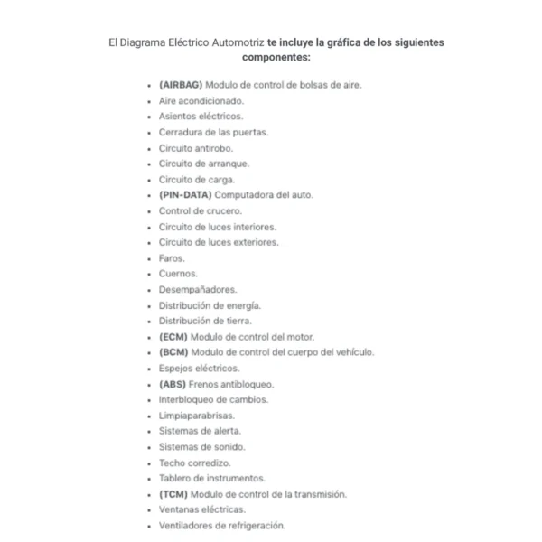 El Diagrama Eléctrico Automotriz te incluye la gráfica de los siguientes componentes: