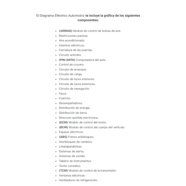 El Diagrama Eléctrico Automotriz te incluye la gráfica de los siguientes componentes: