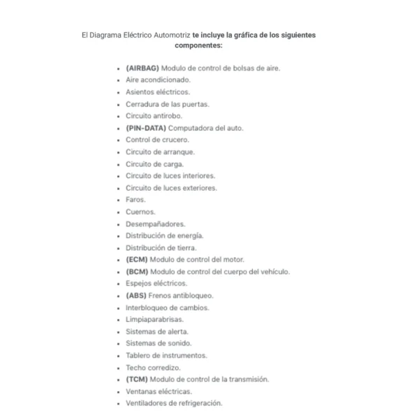 El Diagrama Eléctrico Automotriz te incluye la gráfica de los siguientes componentes: