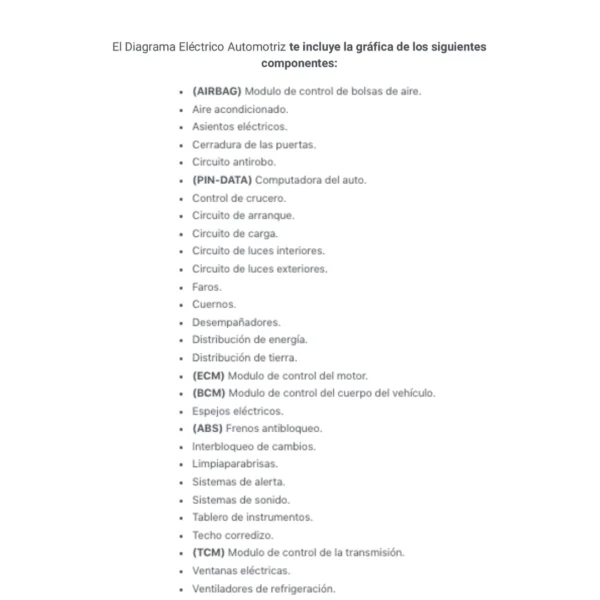 El Diagrama Eléctrico Automotriz te incluye la gráfica de los siguientes componentes: