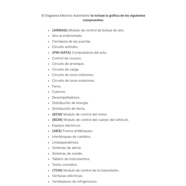 El Diagrama Eléctrico Automotriz te incluye la gráfica de los siguientes componentes: