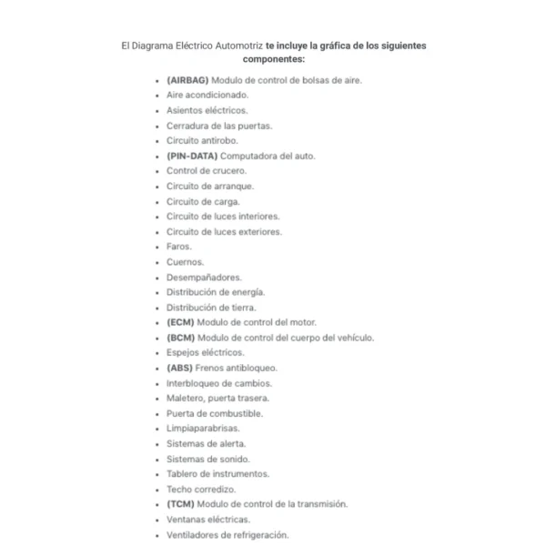 El Diagrama Eléctrico Automotriz te incluye la gráfica de los siguientes componentes: