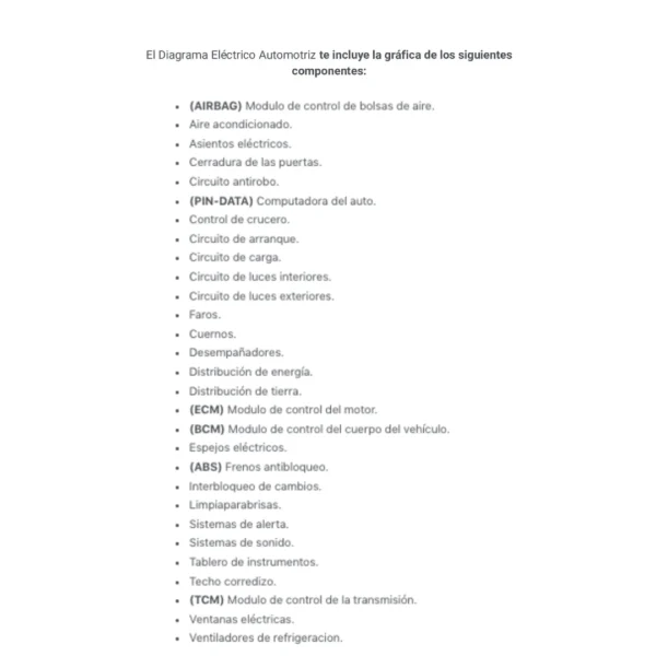 El Diagrama Eléctrico Automotriz te incluye la gráfica de los siguientes componentes: