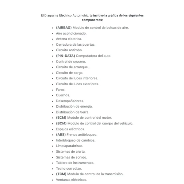 El Diagrama Eléctrico Automotriz te incluye la gráfica de los siguientes componentes: