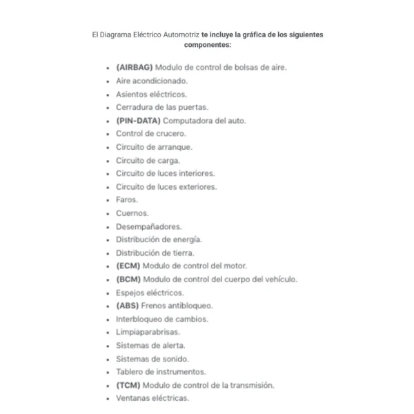 El Diagrama Eléctrico Automotriz te incluye la gráfica de los siguientes componentes: