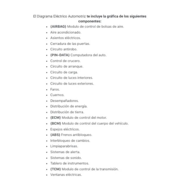El Diagrama Eléctrico Automotriz te incluye la gráfica de los siguientes componentes: