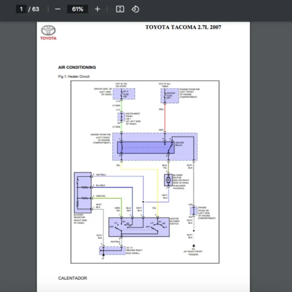 Si estas buscando un manual eléctrico de la marca Toyota modelo Tacoma de 2.7L año 2007, este es el diagrama automotriz que necesitas.