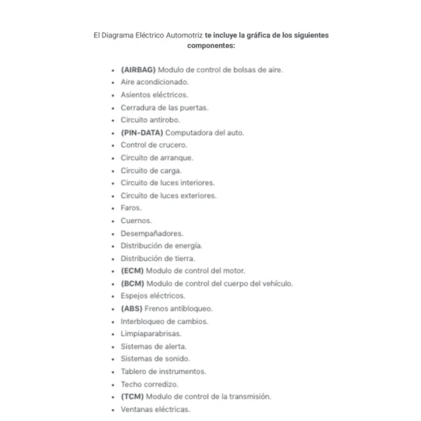 El Diagrama Eléctrico Automotriz te incluye la gráfica de los siguientes componentes: