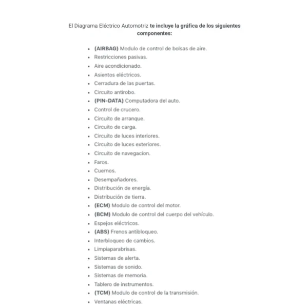 El Diagrama Eléctrico Automotriz te incluye la gráfica de los siguientes componentes:
