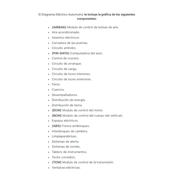 El Diagrama Eléctrico Automotriz te incluye la gráfica de los siguientes componentes: