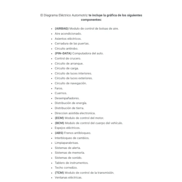 El Diagrama Eléctrico Automotriz te incluye la gráfica de los siguientes componentes: