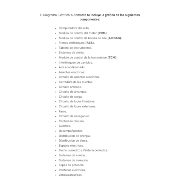 El Diagrama Eléctrico Automotriz te incluye la gráfica de los siguientes componentes: