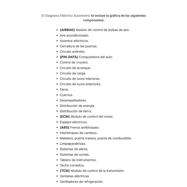 El Diagrama Eléctrico Automotriz te incluye la gráfica de los siguientes componentes: