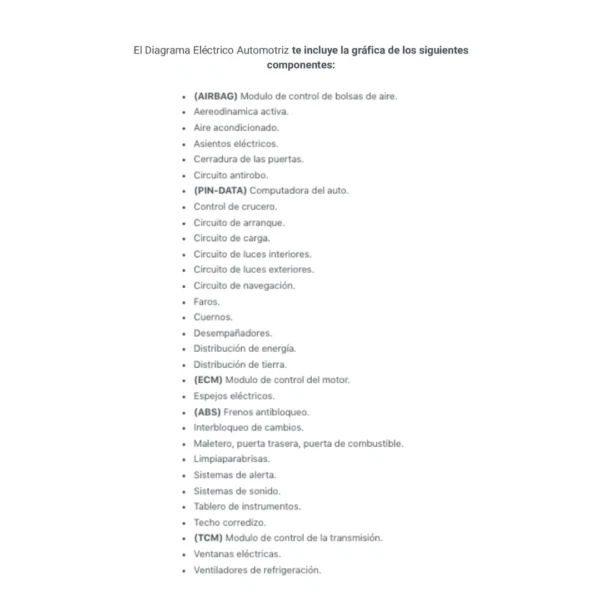 El Diagrama Eléctrico Automotriz te incluye la gráfica de los siguientes componentes: