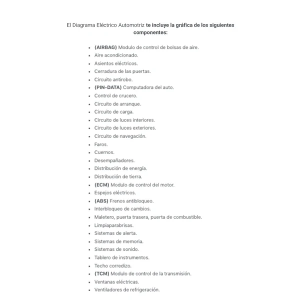 El Diagrama Eléctrico Automotriz te incluye la gráfica de los siguientes componentes: