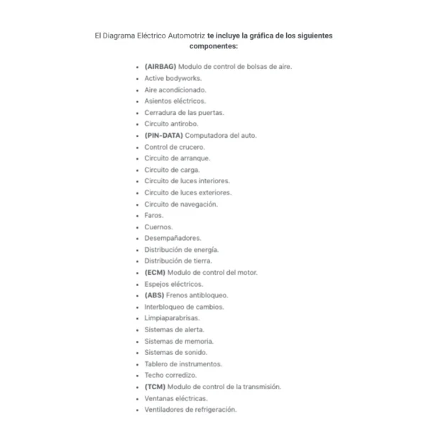 El Diagrama Eléctrico Automotriz te incluye la gráfica de los siguientes componentes: