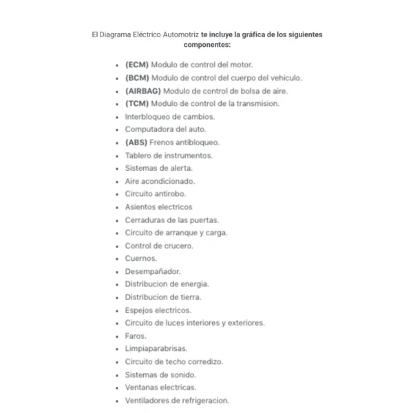 El Diagrama Eléctrico Automotriz te incluye la gráfica de los siguientes componentes: