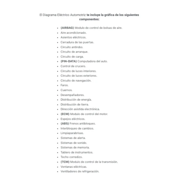 El Diagrama Eléctrico Automotriz te incluye la gráfica de los siguientes componentes: