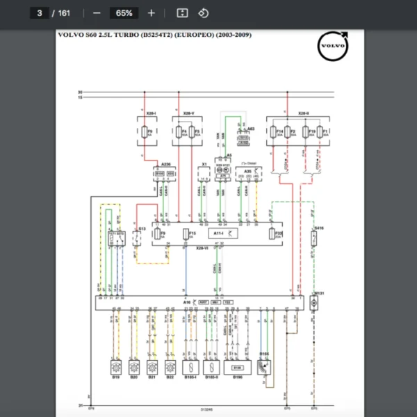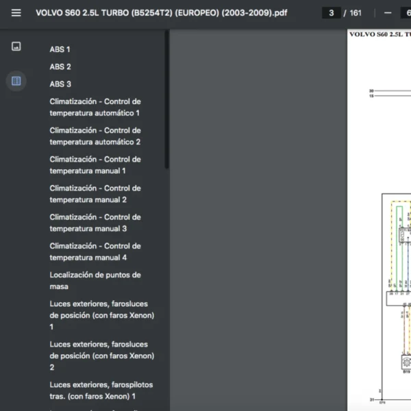 Conexiones. Sensores. Y otros componentes que intervienen en el funcionamiento correcto de los circuitos electrónicos (también llamados en inglés “wiring diagram”). Si estas buscando un manual eléctrico de la marca Volvo modelo S60 año 2003 al 2009 de 2.5L Turbo , este es el diagrama automotriz que necesitas.