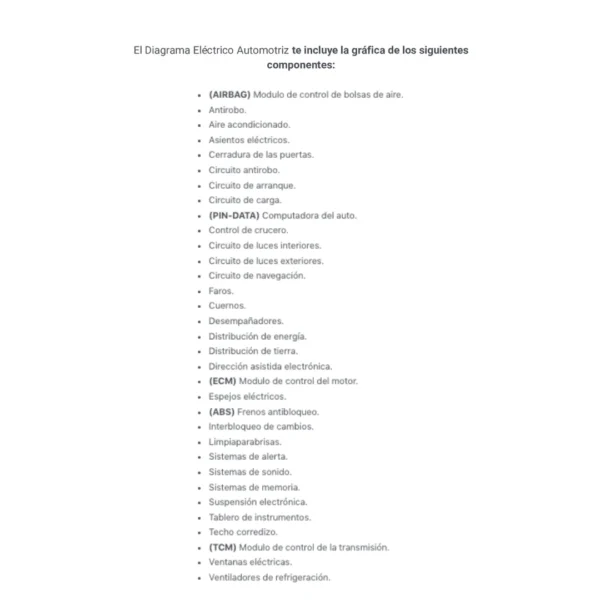 El Diagrama Eléctrico Automotriz te incluye la gráfica de los siguientes componentes: